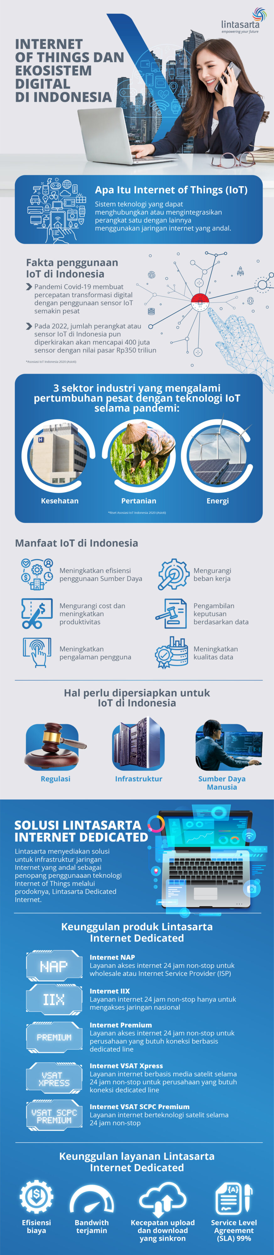 Jika menilai perusahaan sudah saatnya menggunakan Internet Dedicated, Anda bisa menggunakan layanan Lintasarta Internet Dedicated yang dapat langsung terhubung ke saluran backbone (tulang punggung) internasional dan dalam negeri. Selain itu, layanan Internet Dedicated ini tersedia di lebih dari 70 kota di Indonesia dan dapat terhubung melalui berbagai jenis koneksi, mulai dari fiber optik, radio, sampai satelit (VSAT) sesuai kebutuhan.