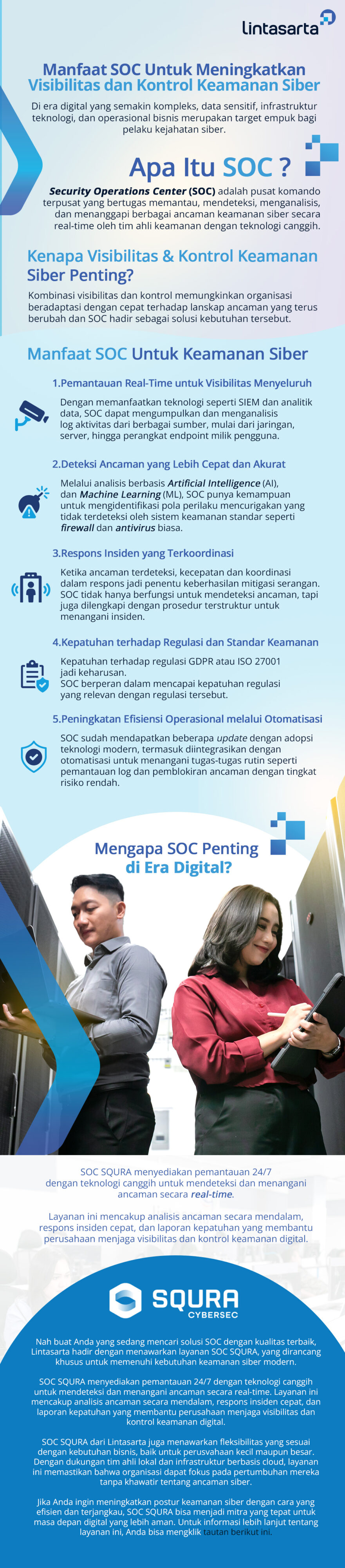 Bagi Anda yang sedang mencari solusi SOC dengan kualitas terbaik, Lintasarta hadir dengan menawarkan layanan SOC SQURA, yang dirancang khusus untuk memenuhi kebutuhan keamanan siber modern.